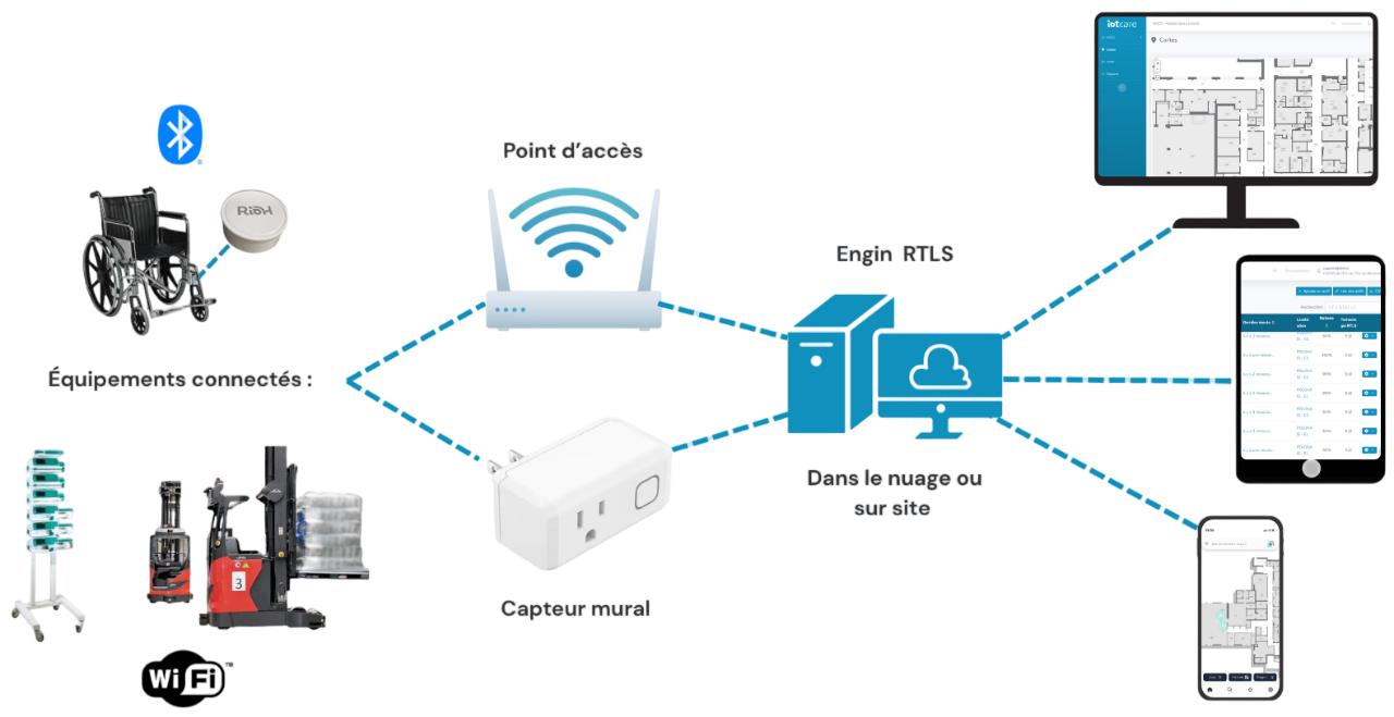 Grâce à la technologie Wi-Fi, IoTcare vous permet de localiser tous les appareils connectés (ordinateurs portables, dispositifs compatibles Wi-Fi, postes de travail mobiles, etc.)